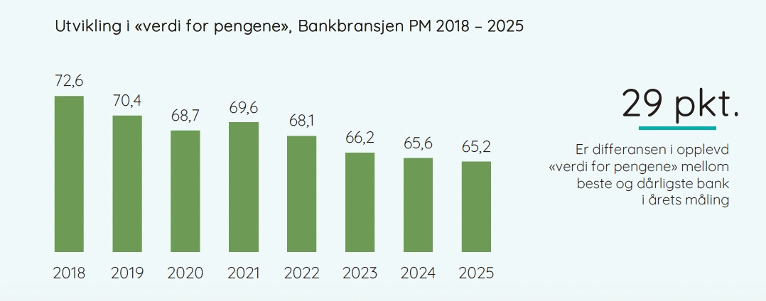 EPSIs bransjeundersøkelse for 2025 viser at kundetilfredsheten fortsatt ligger på historisk lave nivåer. Rundt 37 prosent sier de er svært tilfredse, mens 32 prosent er misfornøyde med hovedbanken sin. Flere kunder opplever dårlige betingelser, og mener det kan lønne seg å se hva andre banker tilbyr.